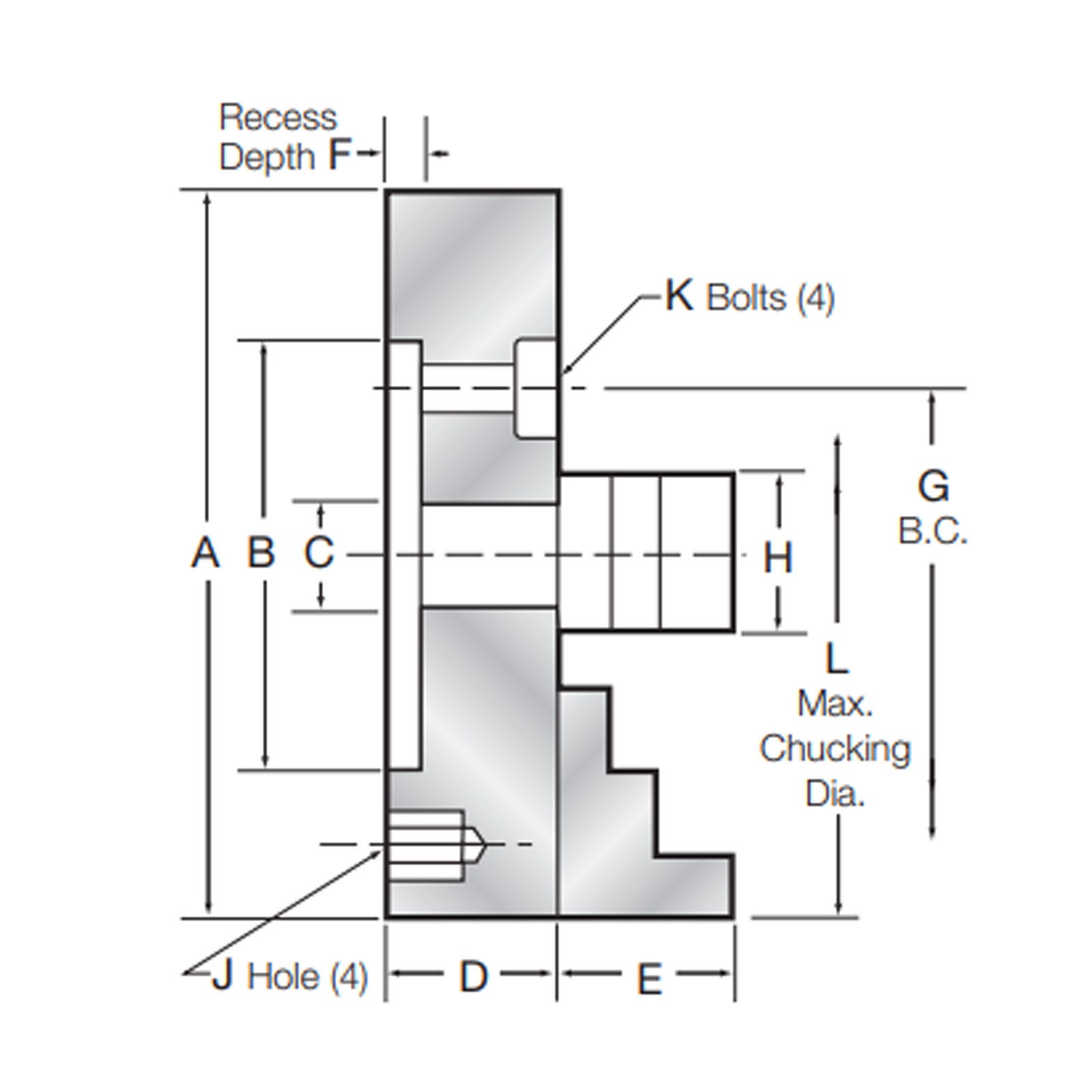 Diameter (mm): 200 | Diameter (Inch): 8" | D: 72 | L: 235 | Clamping Range: 8-178 | H: 32 | Max RPM: 2300 | B: 125 | C: 50 | E: 32 | F: 4 | J: M10 | K: M10 |