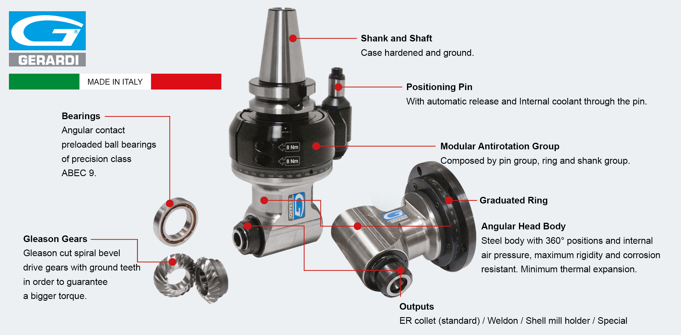 Gerardi's Evolution Line angle heads feature an interchangeable Drive Taper which enables the same angle head to be used of different machines (e.g. BT or SK) simply by changing the input shaft.