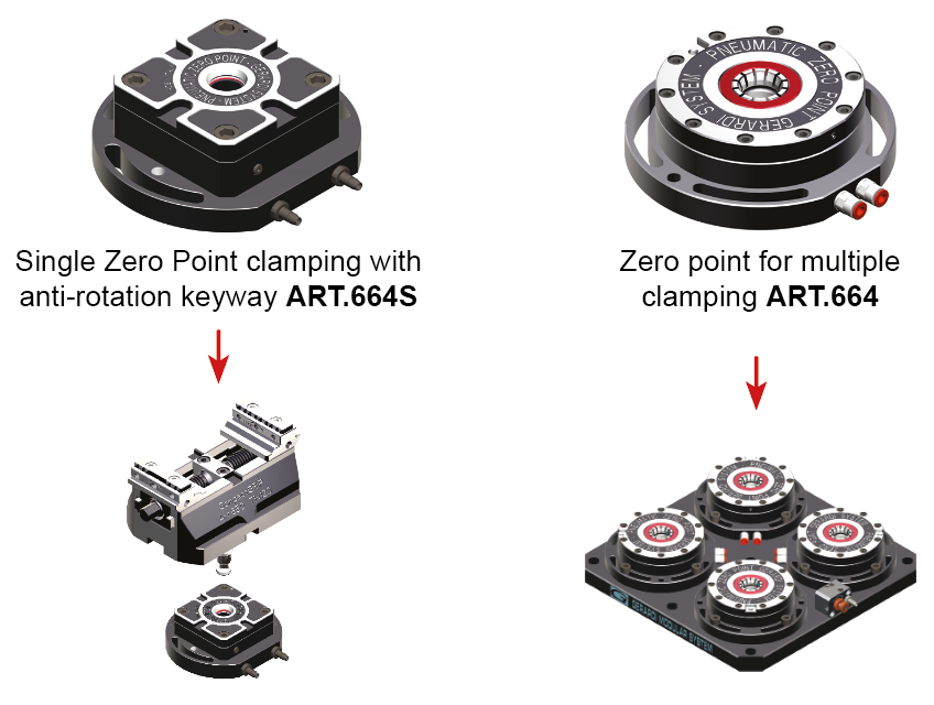 The Gerardi ZERO POINT modular system is the easiest and most cost effective way to reduce down time and increase profits. It can be used on a machine bed with interface plates, on 5 axis machines or on tombstones.